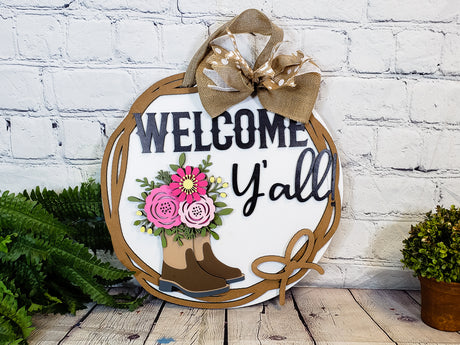 Welcome Y'all Cowboy Boots with Flowers Door Hanger - Lvl 2